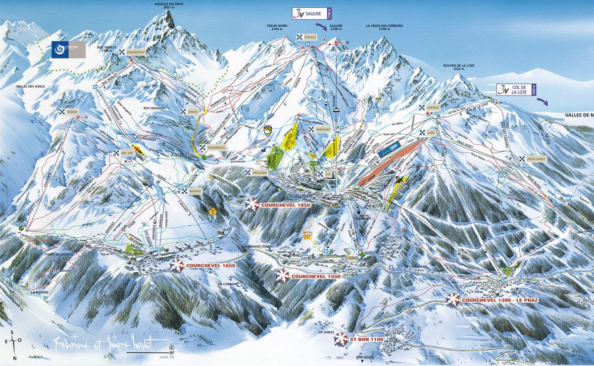 долини Куршевель розташовані на п’яти рівнях: Сен-Бон (Saint-Bon) 1100м, Ле-Праз (Le Praz) 1300м, Куршевель-1550 Куршевель-1650 і Куршевель-1850.