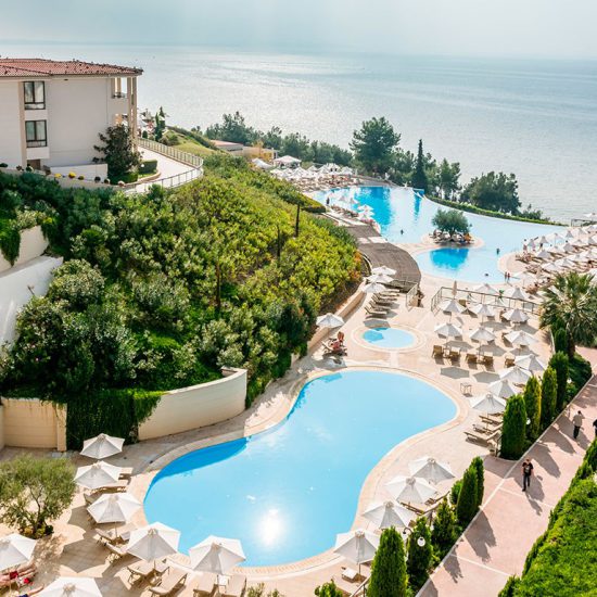Ikos Oceania 5 * розташований на західному узбережжі півострова Кассандра, в 1 км від Неа Муданія, в 50 км від аеропорту м Салоніки, має велику зелену територію і протяжний приватний пляж. Високий рівень кулінарії: шеф-кухаря готелю удостоєні «мішленівських» зірок. Розвинена інфраструктура і широкий вибір розваг на території готелю для дорослих і дітей. У місцях публічного користування є спеціально обладнані зони тільки для дорослих. Готель активно дбає про навколишнє середовище, використовує в ресторанах тільки натуральні місцеві продукти, проводить еко екскурсії та уроки екології для дітей. Рекомендуємо для романтичного та сімейного відпочинку, в тому числі з дітьми різного віку.